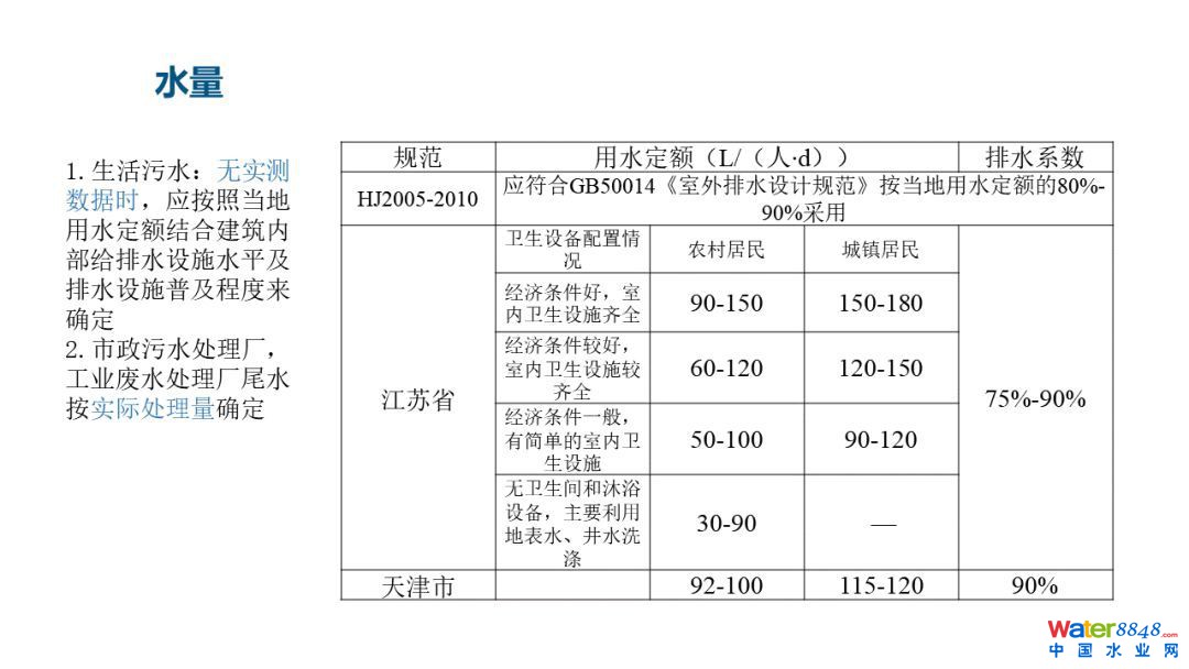 處理水量大小決定著人工濕地建設規(guī)模。農村生活污水具有水量少、居住人口分散、變化系數大等特征,應實地調查農村地區(qū)用水及排水設施情況,考慮是否存在較多生產經營活動等。應在用水定額及排水系數兩個參數上與城鎮(zhèn)生活污水進行一定區(qū)分。