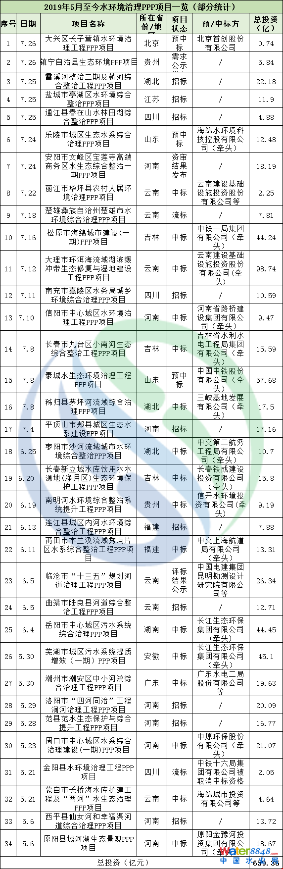 水環(huán)境治理攻堅戰(zhàn)正打得火熱。近來,中國水網(wǎng)不完全統(tǒng)計發(fā)現(xiàn),自2019年5月至今,短短的三個月內(nèi),進入招標、發(fā)布需求公示、發(fā)布資審結(jié)果、預中標、中標等階段的水環(huán)境治理PPP項目已有30余個,總投資近660億,可謂呈現(xiàn)出了爆發(fā)的釋放態(tài)勢。具體項目如下,如有遺漏,歡迎留言補充: