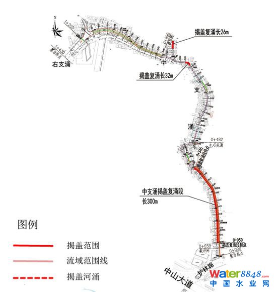 以上為中支涌系統(tǒng)圖。紅色線范圍為工程實施最為困難的暗涌段,若要實現綜合整治的目標,揭蓋復涌避不開少,也構成了項目實施的最大難點。
