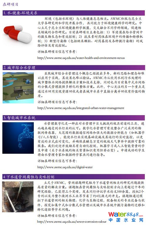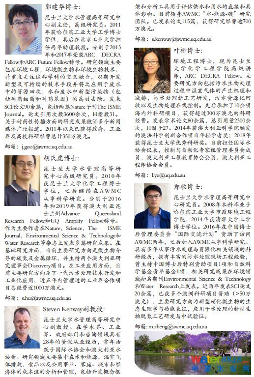 澳大利亞昆士蘭大學(xué)昆士蘭大學(xué)水管理高等研究中心 (Advanced Water Management Centre,AWMC,http://www.awmc.uq.edu.au) 成立于1996年,是目前國際公認(rèn)的頂尖水處理技術(shù)創(chuàng)新中心之一。水管理高等研究中心由澳大利亞工程院院士,國際著名環(huán)境工程專家袁志國教授(Prof. Zhiguo Yuan)領(lǐng)導(dǎo),主要包括水-健康-環(huán)境關(guān)系,城市綜合水管理,智能城市水系統(tǒng),下水道管網(wǎng)腐蝕與臭味控制,新一代污水處理技術(shù)開發(fā),農(nóng)業(yè)資源回收,環(huán)境生物技術(shù)開發(fā),環(huán)境-能源-碳網(wǎng)絡(luò),甲烷的生物轉(zhuǎn)化等九大研究領(lǐng)域。