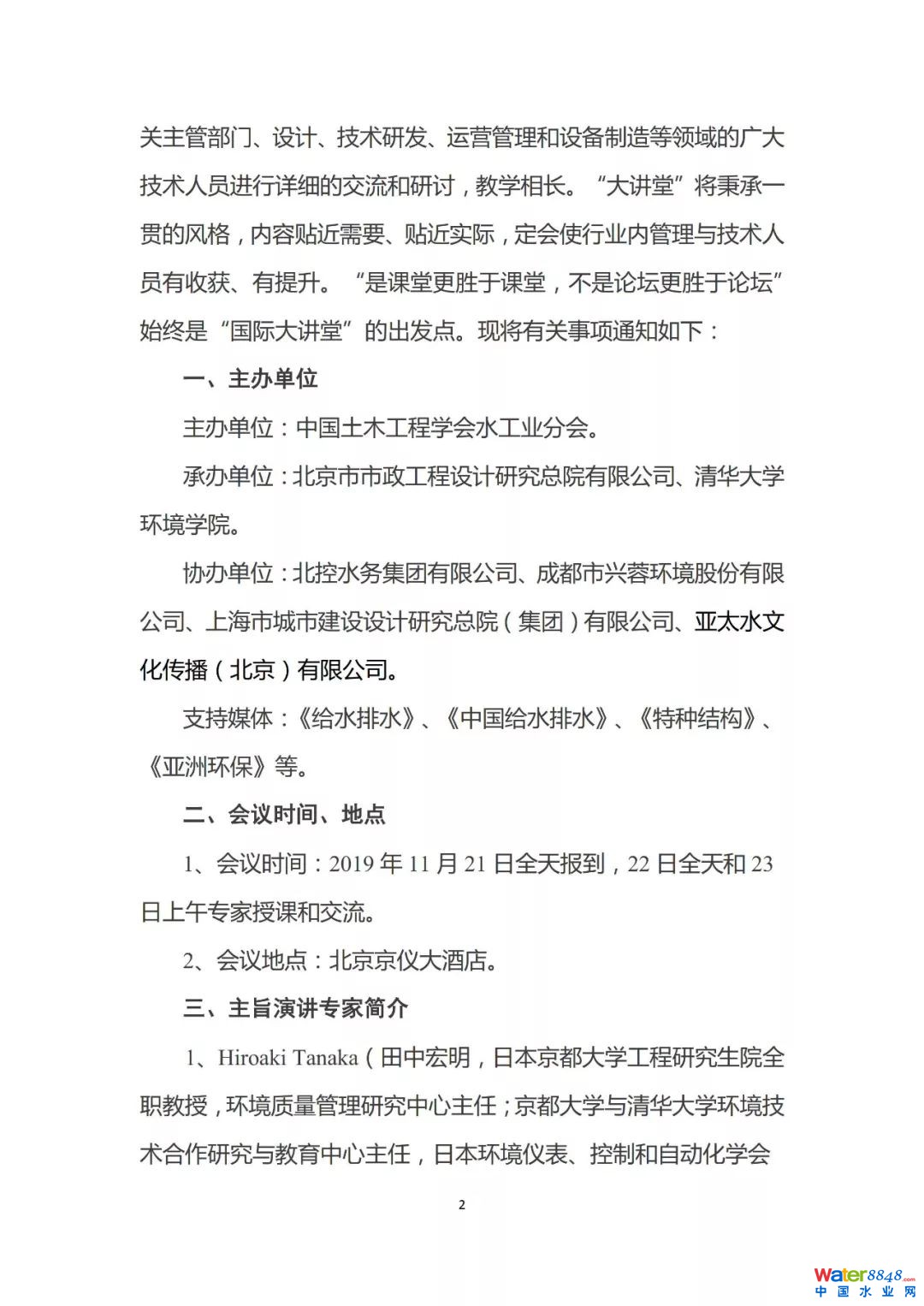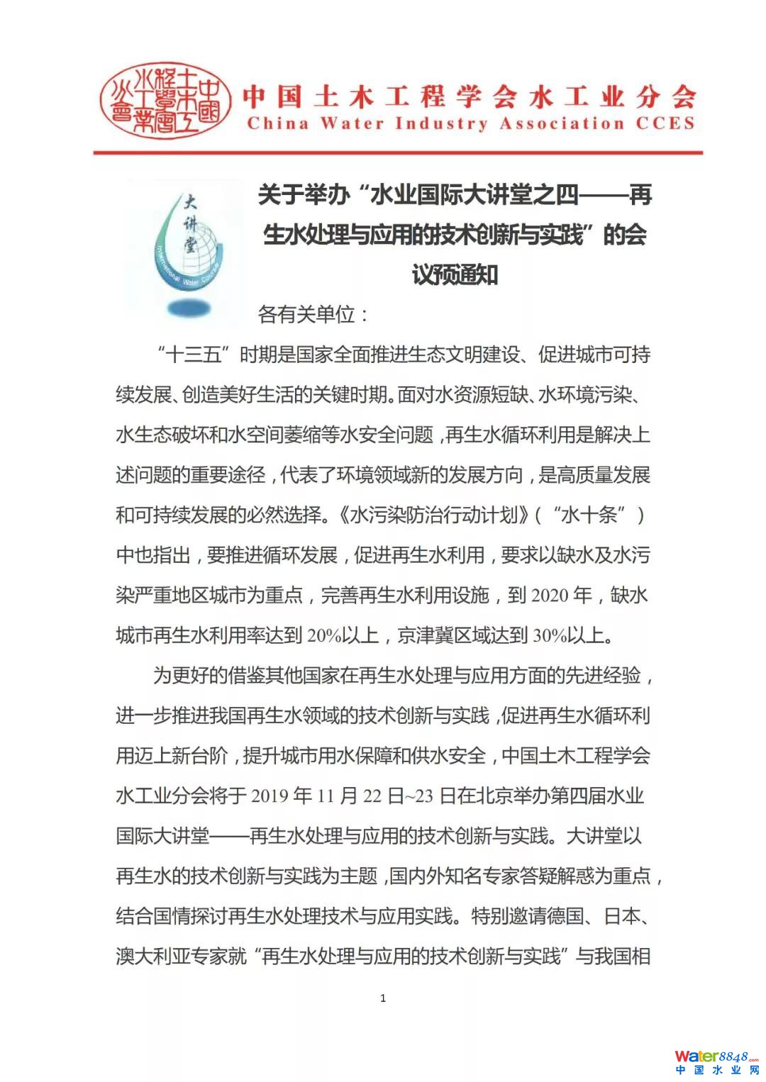 關(guān)于舉辦“水業(yè)國(guó)際大講堂之四——再生水處理與應(yīng)用的技術(shù)創(chuàng)新與實(shí)踐”的會(huì)議預(yù)通知