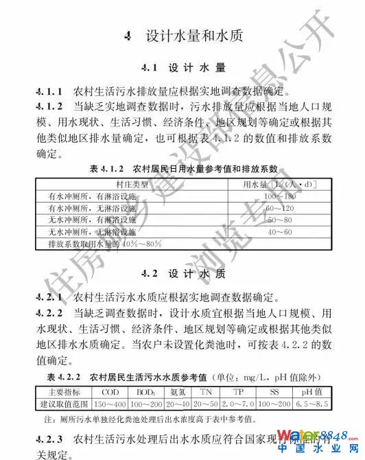 2、設(shè)計水量和水質(zhì)。不同地區(qū)農(nóng)村生活習(xí)慣、生活水平、氣候條件、水源、水資源結(jié)構(gòu)的差異,導(dǎo)致農(nóng)村污水排放和水質(zhì)差異較大,難以給出具體的設(shè)計值。標(biāo)準(zhǔn)所列的數(shù)據(jù)范圍僅在沒有基本數(shù)據(jù)的情況下供當(dāng)?shù)貐⒖肌?/span>實地調(diào)查應(yīng)是確定農(nóng)村污水排放和水質(zhì)的首要選擇。