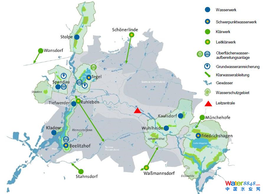 柏林的水循環(huán)體系相對(duì)更新速率較慢。因?yàn)镾pree和Havel河只為柏林城區(qū)提供了較少的水資源,它們通過河岸過濾的方式補(bǔ)充到了飲用水的儲(chǔ)備之中。然而,這兩大河流水量的三分之二其實(shí)已經(jīng)被污水處理廠凈化過一次了。這樣的現(xiàn)狀也對(duì)柏林的污水處理廠提出了很高的要求。在非雨期,柏林城區(qū)要產(chǎn)生65萬立方米的污水,在雨期這個(gè)數(shù)字將要翻倍!為此,6座污水處理廠相應(yīng)配套而建立,Ruhleben污水廠就是其中最重要的一個(gè)。