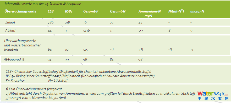 在生化處理環(huán)節(jié),水中的懸浮物,溶解的有機(jī)物以及溶解的無機(jī)物將會(huì)被微生物的新陳代謝過程去除。無機(jī)物的進(jìn)一步去除,是通過特殊的生化反應(yīng),或是投加一定的化學(xué)藥劑實(shí)現(xiàn)的。Ruhleben污水廠的出水中,總磷遠(yuǎn)遠(yuǎn)低于規(guī)定的0.5 mg/L,氨氮低于5 mg/L,總氮低于13 mg/L。Ruhleben污水廠用三組生化池,分別為一組6個(gè)(運(yùn)行水位3.15 m,容積52500 m3),一組6個(gè)(運(yùn)行水位5.15 m,容積84000 m3),一組4個(gè)(運(yùn)行水位厭氧缺氧區(qū)8.15 m,好氧區(qū)5.65 m,容積62000 m3)。