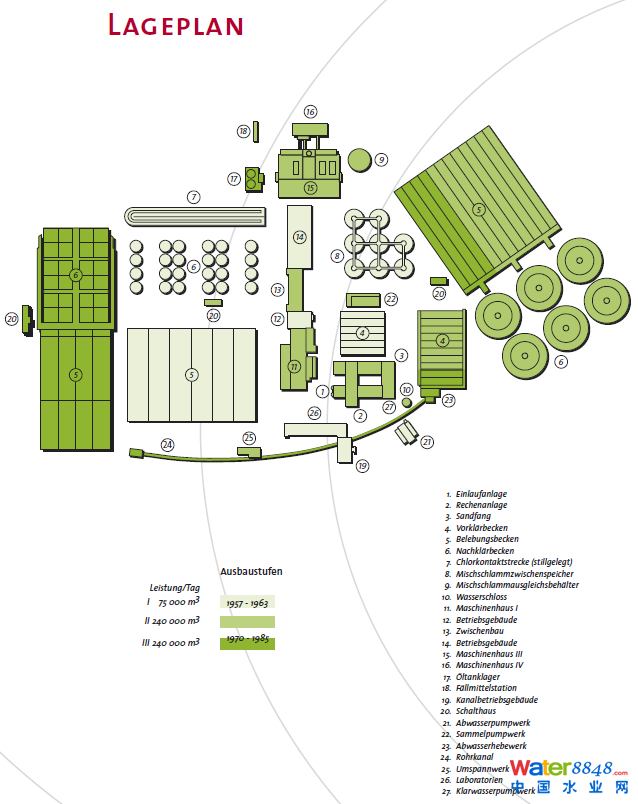 1973新建分流井,并在格柵間后增設(shè)沉砂池,同時(shí)引流出水至Teltow運(yùn)河的泵站投入運(yùn)行