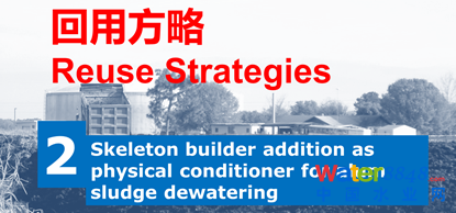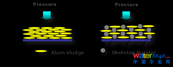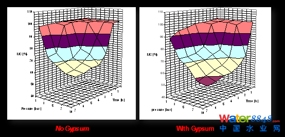 實(shí)驗(yàn)證明,污泥脫水機(jī)械壓縮形成泥餅,加大壓力和增加脫水時(shí)間,最終泥餅含水率差不多,6小時(shí),8小時(shí),10小時(shí),最終泥餅幾乎一樣。是里面有一些水出不來(lái),再加壓,加時(shí)間也出不來(lái)。怎么辦?能不能加一種東西,起名字骨架(skeleton builder),骷髏的意思。加一種東西讓它微觀上支撐,微觀上產(chǎn)生微孔道使一些水可以出來(lái)。我們最后尋找到石膏(gypsum (CaSO4∙2H2O)),石膏是一種土壤改良劑。我們把它加進(jìn)去,混合,再加一點(diǎn)Polymer形成污泥礬花(Floc)顆粒進(jìn)行機(jī)械脫水。試驗(yàn)證明加石膏有這個(gè)作用,有我們?cè)O(shè)想的從微觀上來(lái)說(shuō)起微觀骨架的作用,再加壓時(shí)有更多的水脫出,得到更干的泥餅。