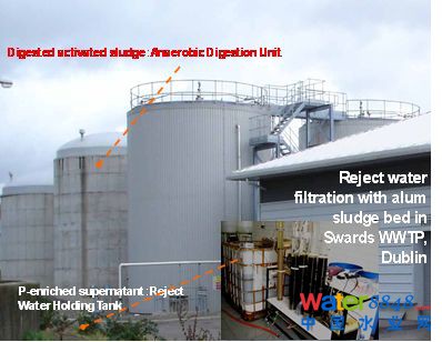 鋁污泥泥餅回用的另一個(gè)方略就是用于污水廠污泥處理工藝中上清液,污泥脫水液(Reject water)的處理。我們說(shuō)生物除磷,這個(gè)磷伴隨生物生長(zhǎng),轉(zhuǎn)移到污泥中去,污泥再經(jīng)厭氧消化分解使磷又釋放到上清液和污泥脫水液里。所以磷在打轉(zhuǎn)轉(zhuǎn),回流,循環(huán)。我們把鋁污泥泥餅?zāi)脕?lái),能不能把它作為一個(gè)吸附劑搞一個(gè)吸附柱,把這個(gè)回流污泥水進(jìn)行吸附。把磷吸附固定在鋁污泥里面。我們選擇了都柏林的一個(gè)新建城市污水處理廠, 現(xiàn)場(chǎng)實(shí)驗(yàn)效果非常好,當(dāng)然有吸附飽和和鋁污泥吸附柱更換問(wèn)題。