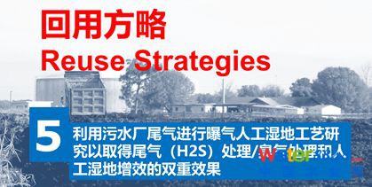 第五個(gè)是利用污水處理廠尾氣進(jìn)行曝氣人工濕地研究。污水處理廠產(chǎn)生臭氣,把這些臭氣進(jìn)行收集,收集后用作鋁污泥型人工濕地的曝氣氣源。我們研究很多,把收集的污水處理廠臭氣從底部通入鋁污泥型人工濕地系統(tǒng),鋁污泥可以吸附臭氣中的硫化氫,同時(shí)給濕地做一點(diǎn)鼓氣作用,促進(jìn)濕地效果,同時(shí)除臭,一舉兩得。