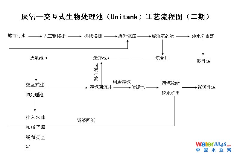 中心城區(qū)污水處理一期工程籌建于1995年,建設(shè)規(guī)模為日處理污水能力5萬噸,2000年10月投產(chǎn)運(yùn)行;二期續(xù)建工程2001年開始實(shí)施,采用Unitank(厭氧-交互式生物處理池)工藝,2003年11月竣工,2005年4月通過項(xiàng)目驗(yàn)收,驗(yàn)收后一、二期工程總處理能力為10萬噸/日。