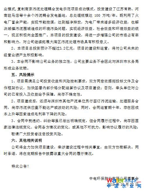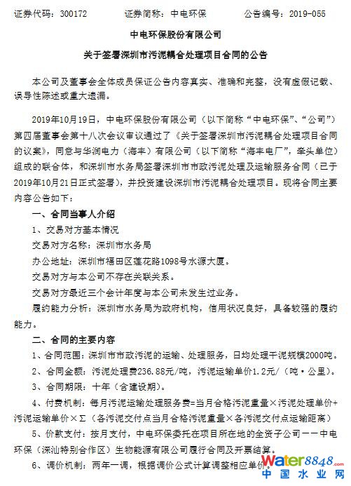 中電環(huán)保簽署深圳市污泥耦合處理項目合同(附公告)