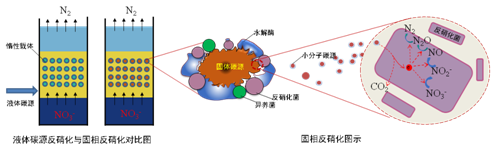 固相反硝化脫氮是指以不溶于水的固相碳源作為反硝化微生物的碳源及生物膜的附著載體,通過微生物自身釋放的胞外酶將固相碳源按需水解為溶解性的小分子有機(jī)物,反硝化微生物利用該部分有機(jī)物進(jìn)行生物反硝化過程。