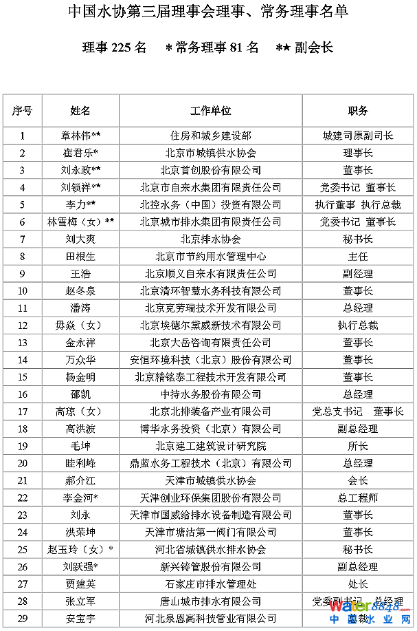 中國(guó)城鎮(zhèn)供水排水協(xié)會(huì)(簡(jiǎn)稱中國(guó)水協(xié),英文譯名為:China Urban Water Association,縮寫為CUWA) 第三屆理事會(huì) 理事 、常務(wù)理事名單