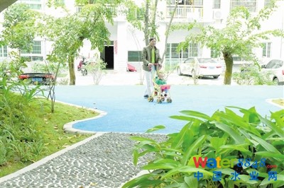 改造后的東岸假日小區(qū)一角,彩色路面可滲水流入地面。 見習記者 陳聰聰 攝
