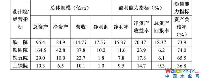 從總體規(guī)模來看,截至2016年底,鐵五院總資產(chǎn)為28.97億元,凈資產(chǎn)值9.99億元,2016年全年完成總營業(yè)收入22.73億元,實現(xiàn)凈利潤1.78億元;從盈利能力來看,鐵五院2016年凈利率為7.8%,凈資產(chǎn)收益率為17.8%,總資產(chǎn)回報率為6.1%;從償債能力來看,鐵五院2016年的資產(chǎn)負債率為65.5%,長期償債能力比前面兩個院略好。