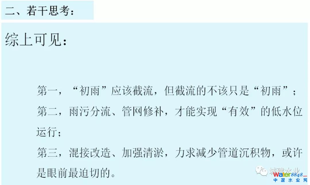 ——“清污分流”、趕外水重要性遠(yuǎn)高于雨污分流改造;污水處理廠進(jìn)水污染物濃度是否得到有效提高,是考量“提質(zhì)增效”工作的重要要素;讓雨水管道旱天沒有水是解決水體下雨就黑的前提!