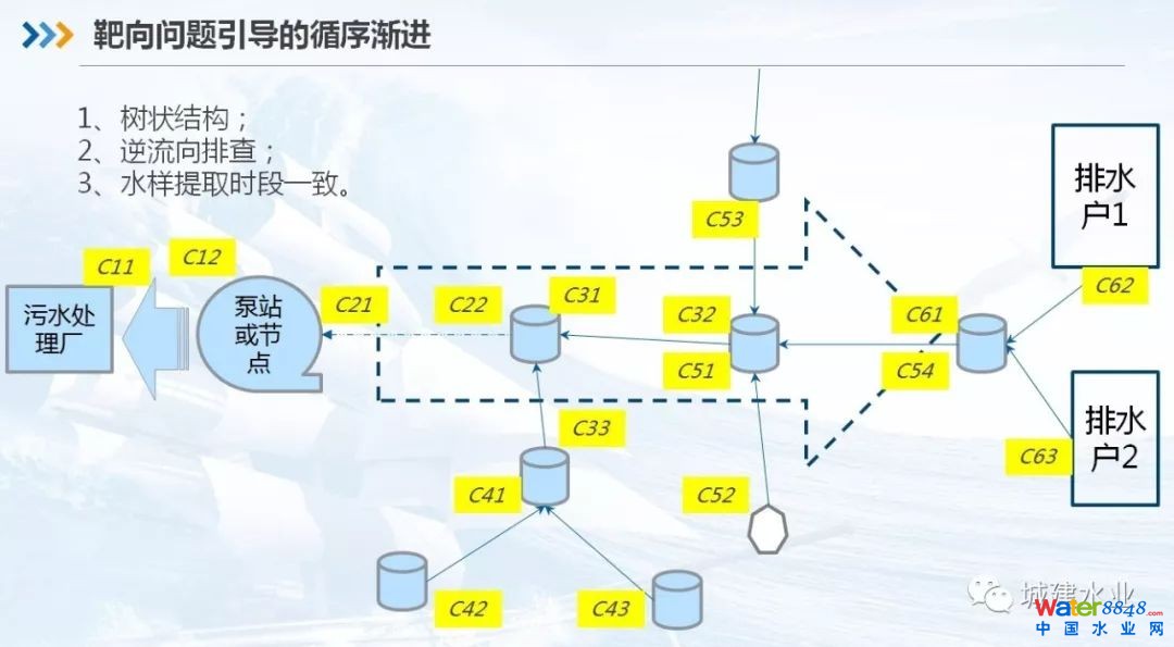 ——從淹沒在水下的排水口、截流管、旱天高水位、滿管流的排水管道查起,查清有無倒灌、有無外水入滲和清污不分;