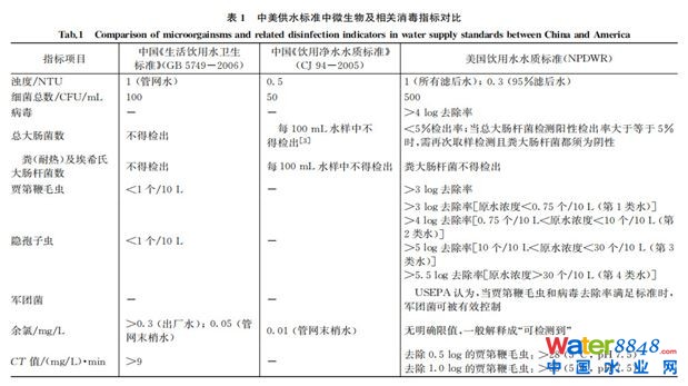1 中美兩國(guó)飲用水微生物標(biāo)準(zhǔn)的對(duì)比