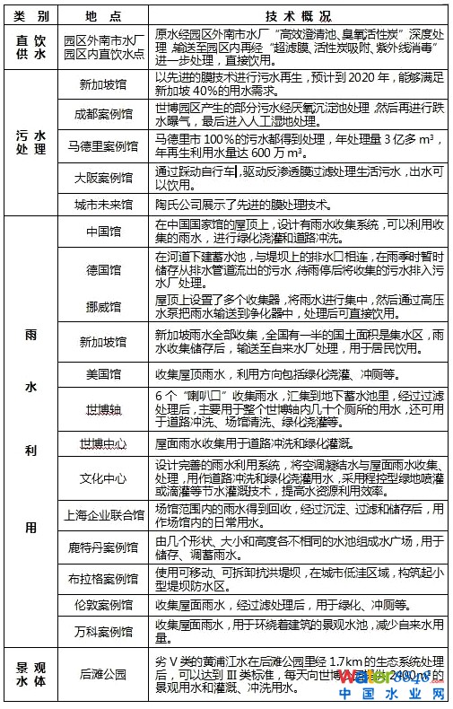 在上海世博會,很多展館和地標(biāo)的設(shè)計(jì)都與水密切相關(guān),很多展館還利用多媒體展示了先進(jìn)的給水排水技術(shù)。各項(xiàng)技術(shù)匯總情況如下表: