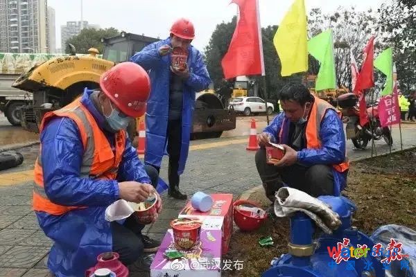 在武漢小湯山模式醫(yī)院建設(shè)現(xiàn)場,一群施工者們正在吃著方便面做午餐。