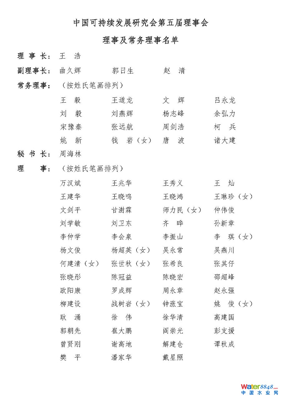 2016年12月21日,中國可持續(xù)發(fā)展研究會(huì)在北京科技會(huì)堂召開第五屆會(huì)員代表大會(huì),選舉產(chǎn)生第五屆理事會(huì)以及研究會(huì)領(lǐng)導(dǎo)班子。研究會(huì)第五屆理事會(huì)由76位理事構(gòu)成,其中常務(wù)理事16名。第五屆領(lǐng)導(dǎo)班子由5位成員構(gòu)成:理事長王浩院士;副理事長曲久輝院士;副理事長郭日生巡視員;副理事長趙清總經(jīng)理;秘書長周海林研究員。