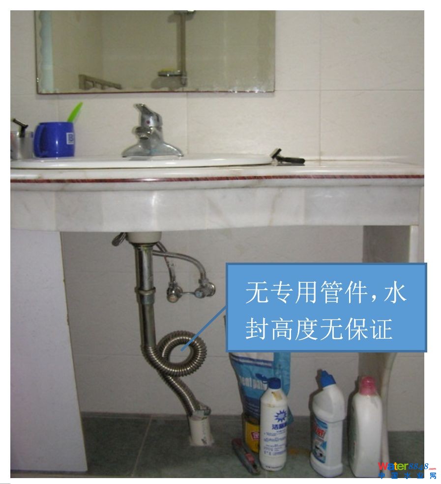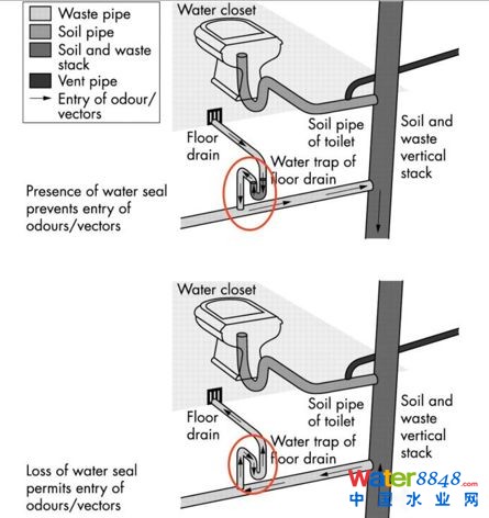 特別強(qiáng)調(diào),向水封或器具中補(bǔ)水時(shí),不要大量快速補(bǔ)水,這樣會(huì)形成瞬時(shí)的虹吸,反而會(huì)把水封中的水抽走;一定要細(xì)水流慢速補(bǔ)水,直至液面不增高為止(可用座便器試一下,便可理解)。