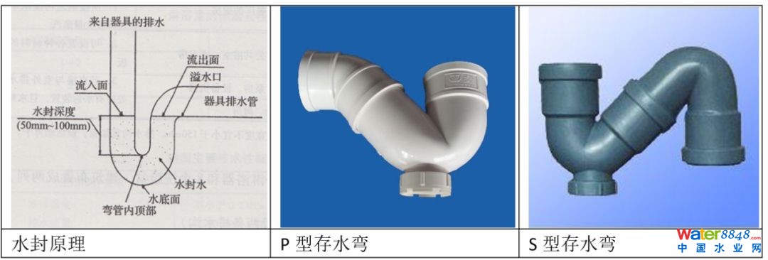 水封是每一個(gè)排水器具(便器、浴缸、洗衣機(jī)、洗滌池、洗手盆、地漏、拖布池)與排水系統(tǒng)連接時(shí),用來抵抗排水管內(nèi)氣壓變化,防止排水管道系統(tǒng)中氣體竄入室內(nèi)的一定高度的水柱,通常用存水彎(S 型、P 型)來實(shí)現(xiàn)。