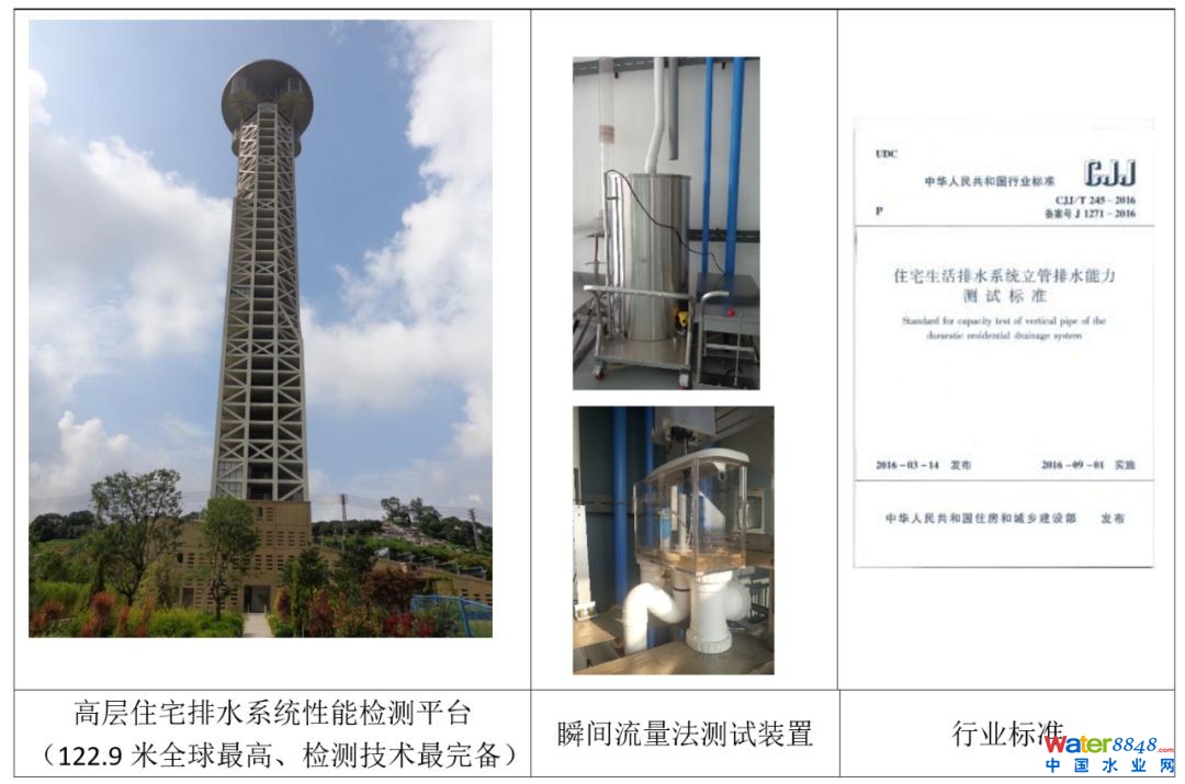 2 )建筑排水系統(tǒng)排水性能評(píng)測(cè)技術(shù)(建立了標(biāo)準(zhǔn)的檢測(cè)平臺(tái)、裝置與檢測(cè)標(biāo)準(zhǔn))