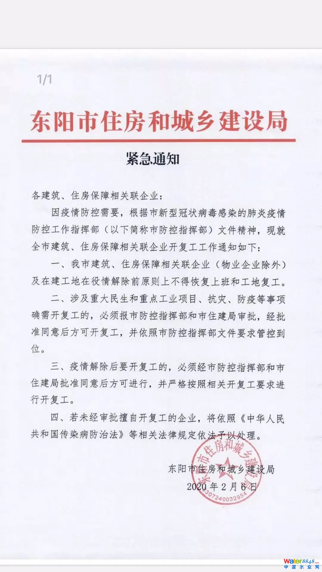 近日、東陽市住建局發(fā)文要求各單位新冠肺炎解除前不得復工,原文如下: