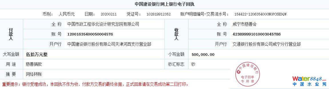 云上咸寧報道(記者 游燕)今天(11日)下午,咸寧市慈善會收到來自中國市政工程華北設(shè)計研究總院有限公司捐贈的50萬元款項,根據(jù)對方意愿,這筆款項將定向用于咸寧市疫情醫(yī)療保障和防控工作。