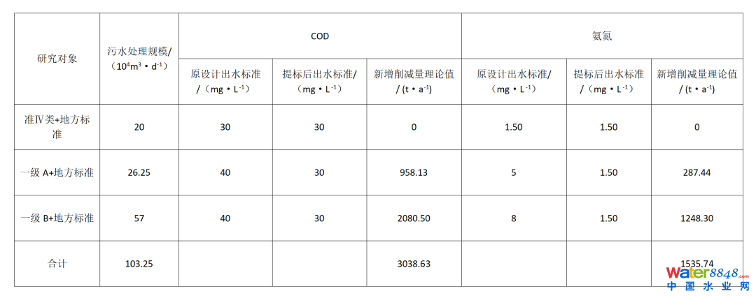 表2 東莞市城鎮(zhèn)污水處理廠提標(biāo)改造污染物削減理論值