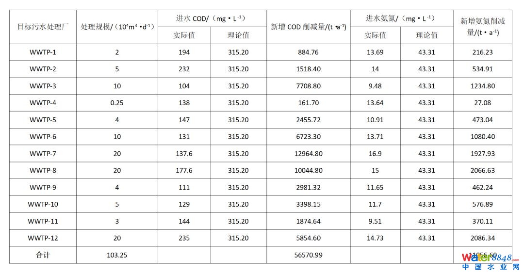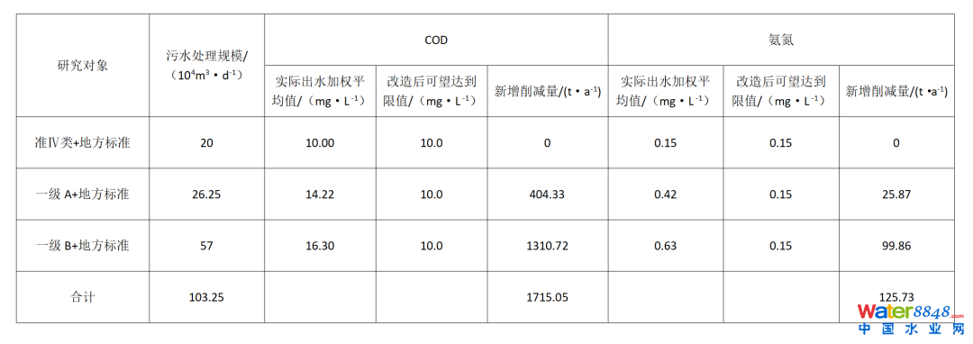 各目標(biāo)污水處理廠實(shí)際執(zhí)行的出水標(biāo)準(zhǔn),分為“準(zhǔn)Ⅳ類+地方標(biāo)準(zhǔn)” “一級(jí)A+地方標(biāo)準(zhǔn)”和“一級(jí)B+地方標(biāo)準(zhǔn)”三類,對(duì)應(yīng)的污水處理規(guī)模分別為20×10 4、26.25×10 4和57×10 4m3/d。根據(jù)陳瑋等的研究方法,計(jì)算得出12座城鎮(zhèn)污水處理廠提標(biāo)改造新增污染物削減量理論值,結(jié)果見表2。