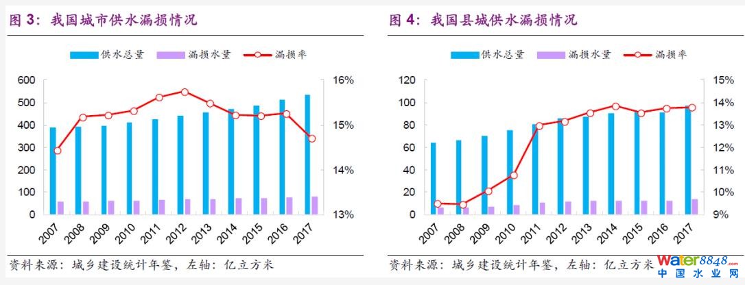 根據(jù)城鄉(xiāng)建設(shè)統(tǒng)計(jì)年鑒的統(tǒng)計(jì),近年來(lái)我國(guó)的給水管網(wǎng)漏損情況相對(duì)嚴(yán)重,城市供水漏損率常年維持在15%左右的水平,和國(guó)際重點(diǎn)城市對(duì)比亦處于高位。我們認(rèn)為漏損控制并未改善的核心原因一方面在于管網(wǎng)的老舊破損情況并未有顯著改善,另一方面則因?yàn)樽詠?lái)水廠多屬于國(guó)有事業(yè)單位,管理效率和經(jīng)營(yíng)動(dòng)力相對(duì)缺乏,跑冒滴漏情況嚴(yán)重。
