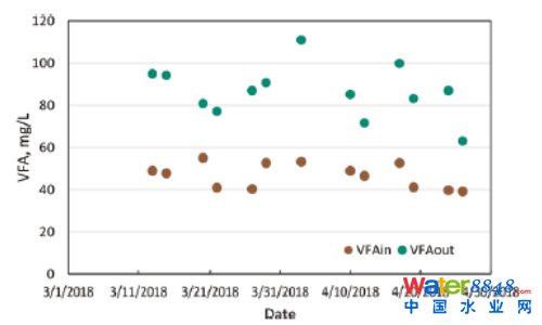 圖2 生產(chǎn)規(guī)模初級(jí)污泥發(fā)酵中的VFA進(jìn)出,顯示平均增加40 mg-VFA/L [VFA出 -VFA入],溫度16–18°C,NH4-N和磷的凈釋放量分別為2和1 mg/L。