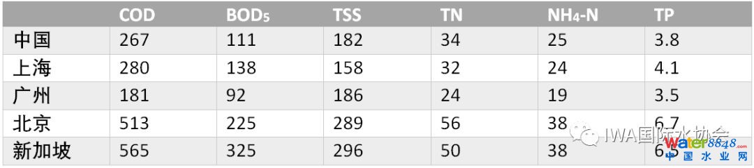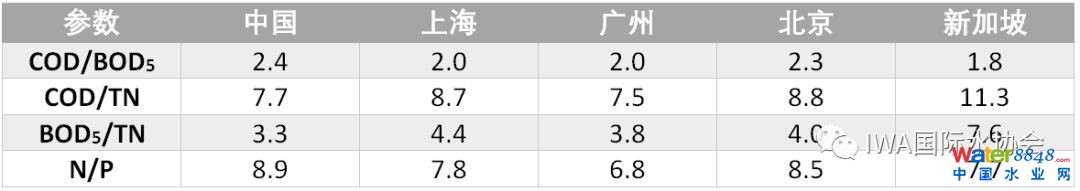 表1. 中國(guó)各地區(qū)污水廠進(jìn)水水質(zhì)和新加坡的對(duì)比(單位:mg/L)