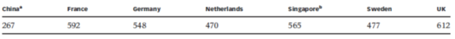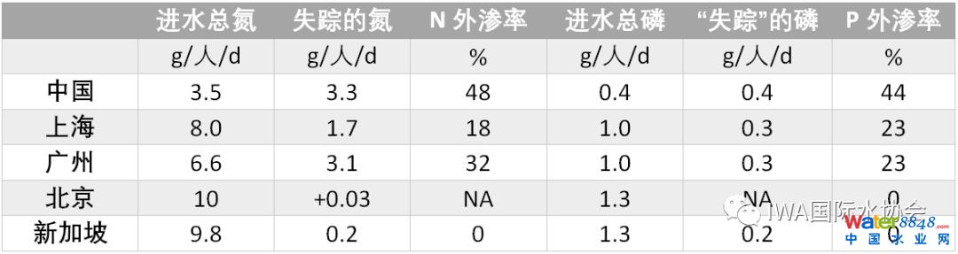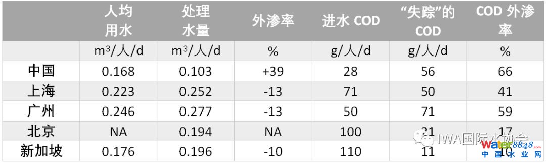 初步計(jì)算反映了中國(guó)污水管網(wǎng)存在嚴(yán)重的滲漏問題。在這次研究里,他們專門考察了北京、上海和廣州的情況,并和新加坡進(jìn)行對(duì)比。下表是人均用水和滲漏對(duì)比的概況,統(tǒng)計(jì)的都是處理量在10萬m³/天以上的污水廠。