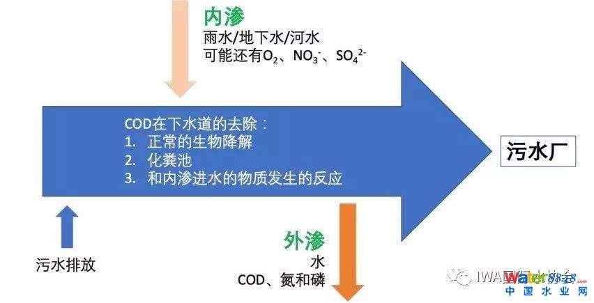 研究人員將污水廠進(jìn)水的氮磷濃度分解為三個(gè)來源,第一是人們?nèi)粘I钣盟a(chǎn)生的負(fù)荷,第二是污水管網(wǎng)的內(nèi)滲和外滲,第三是少量進(jìn)入管網(wǎng)的工業(yè)廢水。此外,還有部分污水在管網(wǎng)里發(fā)生生物降解,這都會(huì)影響進(jìn)水COD的濃度。