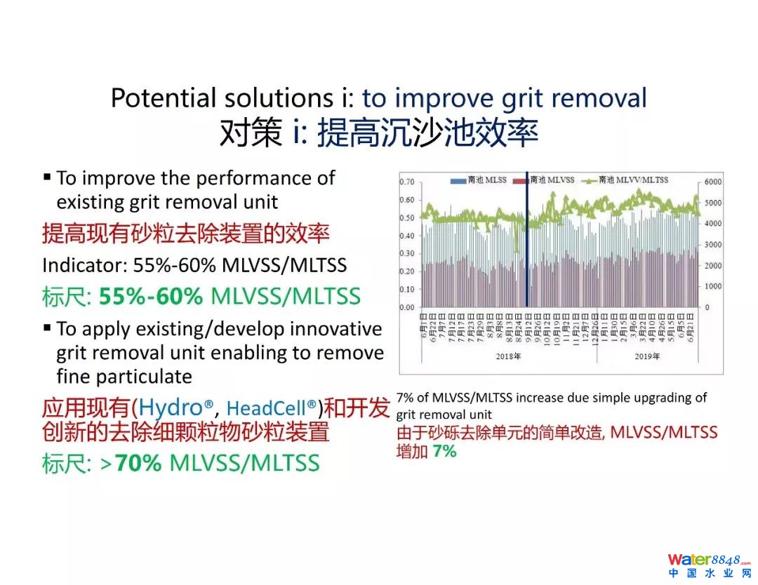 ii. 通過提高除砂裝置的效率來減少過程中的ISS積累:通過提高除砂效率可使混合液中的揮發(fā)性固體成分增加約10%,有望將小型污水處理廠的混合液中的揮發(fā)性固體成分提高到55%-60%,中大型污水處理廠(≥50,000 m³/d)提高到60 %- 65%,