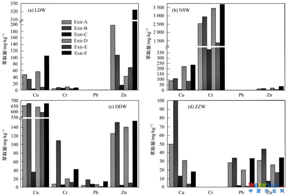 圖 1不同類型萃取劑對污泥中重金屬萃取量Fig.1Extraction concentrations of heavy metals in sewage sludge by different extractants |