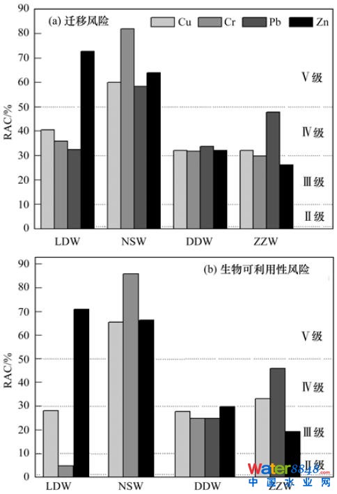 據(jù)生物可利用態(tài)重金屬最大萃取量,LDW中Cu、 Cr和Zn生物可利用態(tài)分別為重金屬總量的28.1%、 4.8%和70.9%; NSW中Cu、 Cr和Zn生物可利用態(tài)分別為總量的65.5%、 86.0%和66.4%; DDW中Cu、 Cr、 Pb和Zn生物可利用態(tài)分別占總量的27.7%、 24.9%、 24.9%和29.8%; ZZW中Cu、 Pb和Zn分別占總量的33.1%、 46.0%和19.2%.總體而言,污泥酸性越強,其中重金屬的生物可利用性越高,這與重金屬形態(tài)可遷移性一致.