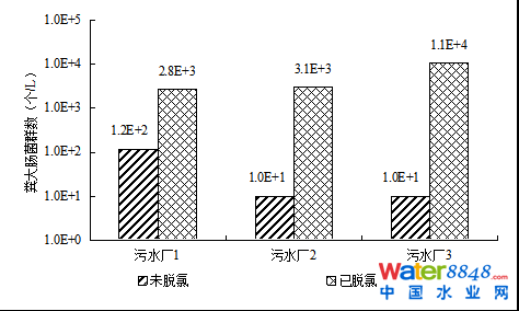 為研究脫氯對檢測水樣中糞大腸菌群數(shù)的影響,在3座污水處理廠總排放口處分別取經(jīng)次氯酸鈉消毒后出水水樣,一組在現(xiàn)場使用硫代硫酸鈉脫氯,一組為未脫氯作為對照組。經(jīng)標準方法檢測后發(fā)現(xiàn),未脫氯水樣中的糞大腸菌群數(shù)明顯低于已脫氯水樣中的糞大腸菌群數(shù)(見圖9)。另外,從3座污水處理廠的出水對比數(shù)據(jù)來看,已脫氯水樣中糞大腸菌群數(shù)可超出未脫氯水樣的10~1000倍不等,說明余氯的存在會嚴重干擾糞大腸菌群數(shù)檢測的準確性,從而影響對實際消毒效果的準確判斷,因此建議采樣時應對水樣進行脫氯處理。