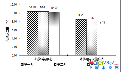 為研究次氯酸鈉有效氯含量隨時間的變化規(guī)律,將次氯酸鈉原液避光加蓋保存3d,每天檢測其有效氯含量,同時與3d內(nèi)現(xiàn)場儲藥罐中同批次次氯酸鈉的有效氯含量作對比。如圖8所示,可見保存方法得當?shù)拇温人徕c原液的有效氯含量并未發(fā)生明顯改變,而現(xiàn)場儲藥罐內(nèi)次氯酸鈉的有效氯含量卻發(fā)生了明顯的衰減,且日均衰減速率超過10%。這主要是由于現(xiàn)場儲藥罐存在罐體上蓋密封不嚴、露天暴曬、灌注新藥時罐內(nèi)舊藥余量過多等問題。有效氯含量的變化也會影響次氯酸鈉投加量的準確性。因此建議污水處理廠應重視對次氯酸鈉試劑的現(xiàn)場管理,宜采用避光(黑色或深色)、密封(留一出氣口)、耐腐蝕(如聚四氟乙烯)的罐體存儲,并盡量在使用至低液位處再灌注新藥。