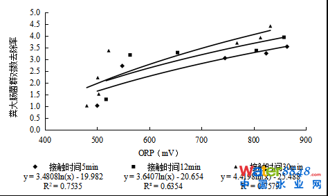 ORP可以反映溶液的氧化還原性。其值越高,溶液的氧化性越強;反之,其值越低,溶液的還原性越強。有文獻報道了ORP值與氯對一些微生物和細菌的殺滅效果高度相關。本研究表明,糞大腸菌群對數(shù)去除率與反應后水樣的ORP值呈現(xiàn)較好的對數(shù)相關性,如圖3所示,接觸時間5、12、30 min的相關系數(shù)(R)值分別為0.8680、0.7971、0.8706,推測出現(xiàn)這一相關性正是由于水中投加了次氯酸鈉這類氧化劑后,引起水質(zhì)的氧化還原電位發(fā)生了改變?紤]到糞大腸菌群數(shù)等致病微生物指標的檢測周期一般需要48h,目前部分歐美發(fā)達國家已普遍采用ORP值控制泳池水的消毒效果。因此為簡單快速預判污水處理廠出水糞大腸菌群的去除效果,建議在出水排放口處安裝在線ORP儀以輔助判斷消毒效果。