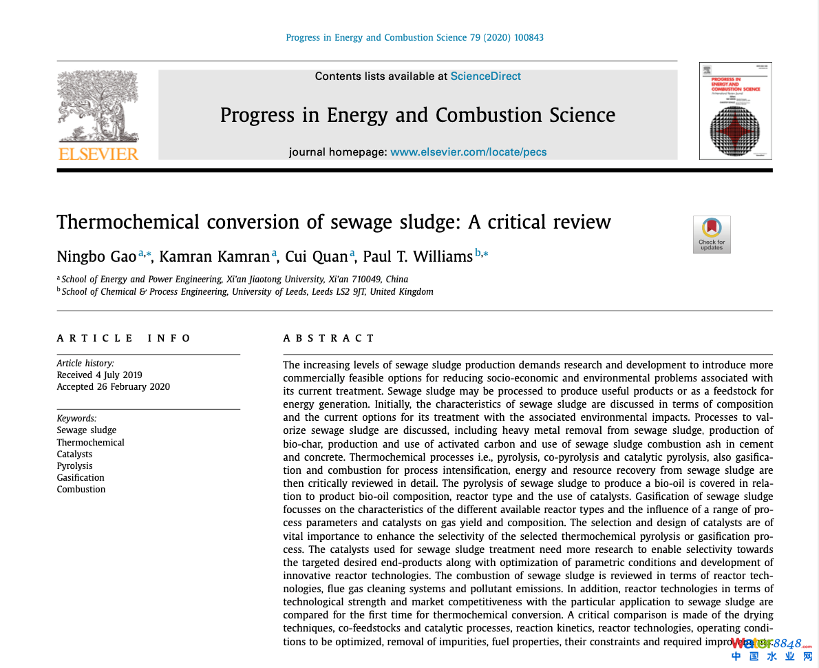 上述研究成果以《污泥的熱化學轉化:評述》為題在國際權威期刊《能源與燃燒科學進展》Progress in Energy and Combustion Science(影響因子26.47)上發(fā)表!赌茉磁c燃燒科學進展》是能源與燃燒領域頂級期刊之一,每年僅發(fā)表30余篇邀稿學術論文。西安交通大學能源與動力工程學院高寧博副教授為論文的第一作者和通訊作者,英國利茲大學Paul T. Williams教授為共同通訊作者。西安交通大學為論文第一通訊作者單位。