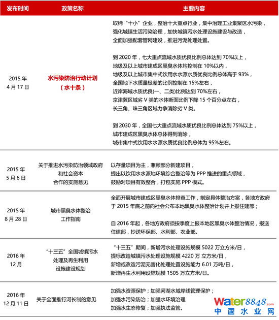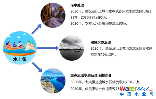 《水污染防治行動(dòng)計(jì)劃 》,又稱“水十條”,是我國水環(huán)境治理政策建設(shè)的里程碑,標(biāo)志著我國水環(huán)境治理開始從過去的污水治理、截污管網(wǎng)等末端治理模式,延伸至源頭控制、過程阻斷以及末端治理全過程協(xié)同的新模式,涉及污水治理、流域修復(fù)、城市排污管網(wǎng)建設(shè)、以及景觀建設(shè)等眾多行業(yè)領(lǐng)域。