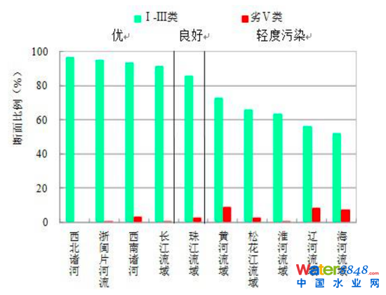 分流域來看,長江、黃河、珠江、松花江、淮河、海河、遼河等七大流域及西北諸河、西南諸河和浙閩片河流I-III類水質(zhì)斷面比例為79.1%,同比上升4.8個(gè)百分點(diǎn);劣V類為3.0%,同比下降3.9個(gè)百分點(diǎn)。其中,西北諸河、浙閩片河流、西南諸河和長江流域水質(zhì)為優(yōu);珠江流域水質(zhì)良好;黃河、松花江、淮河、遼河和海河流域?yàn)檩p度污染。黃河、遼河及海河流域劣V類占比較高。