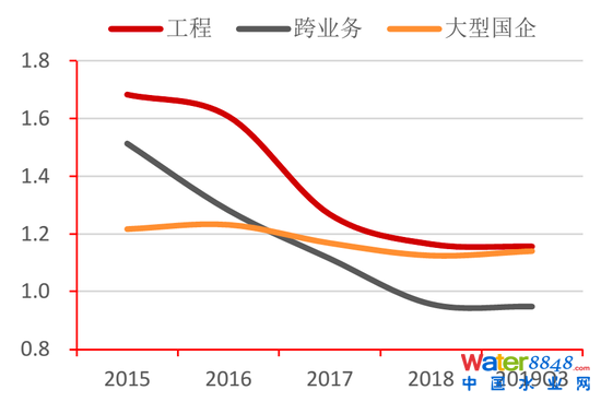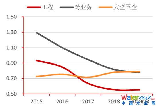 與同樣涉足工程項(xiàng)目的兩類企業(yè)相比,大型國企的流動(dòng)比率和速動(dòng)比率更穩(wěn)定,且呈小幅上升趨勢。2019年第三季度,大型國企的流動(dòng)比率為1.14,高于跨業(yè)務(wù)企業(yè);速動(dòng)比率為0.79,高于傳統(tǒng)工程類水企。