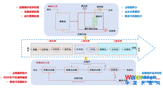 目前我國單一污水處理項(xiàng)目的技術(shù)路徑相對成熟,為三級(jí)處理路徑;其中二級(jí)處理主要以傳統(tǒng)的A2O工藝、以及以碧水源(9.390, -0.20, -2.09%)為代表的MBR工藝兩種模式,兩者的技術(shù)積累均已相對成熟,但在投資規(guī)模、凈化效果、成本構(gòu)成方面各有優(yōu)勢與短板。