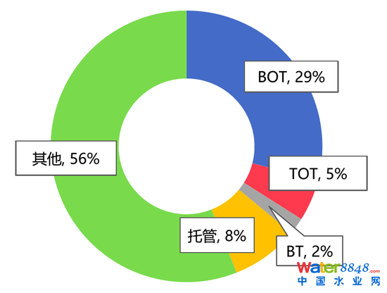 當(dāng)前,我國污水處理項(xiàng)目主要以BOT方式建設(shè)和運(yùn)營,單純的管理或維護(hù)市場份額較小。從市場化的模式來看,BOT、TOT、BT、托管分別占29%、5%、2%和8%,BOT模式是已投入運(yùn)營污水處理廠市場化投資的主流模式。