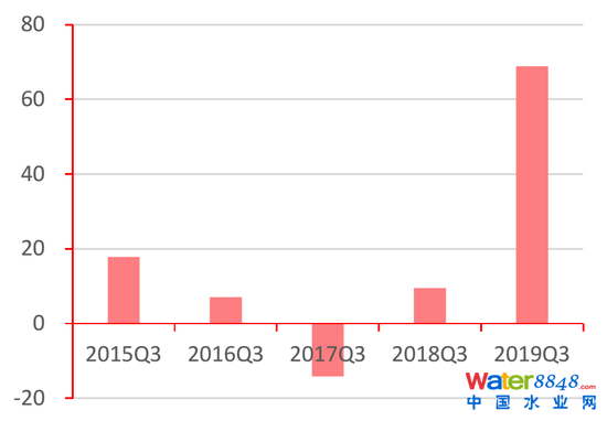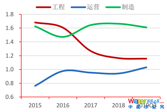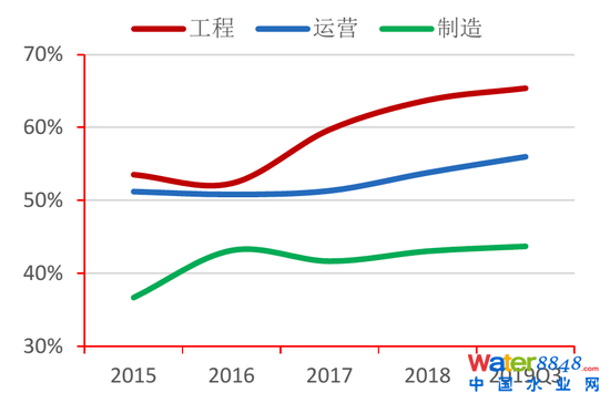 自2017年起,受市場信用收緊環(huán)境影響,各類水企的杠桿率呈明顯上升趨勢,不斷逼近國務(wù)院針對一般工業(yè)企業(yè)杠桿率的指導(dǎo)意見值70%(工程類非工業(yè)企業(yè)為75%),其中工業(yè)類企業(yè)杠桿率明顯高于其他類企業(yè),2019年第三季度達(dá)65.40%。
