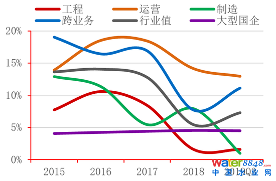 1)2014年起,PPP市場的開放和諸多環(huán)保政策的激勵(lì)使行業(yè)內(nèi)企業(yè)規(guī)模不斷擴(kuò)張,訂單量大幅上升,營收向好;而2017年起由于PPP項(xiàng)目“清庫”政策的出臺(tái),信貸收緊,行業(yè)增速放緩。受其影響最重的工程類公司債務(wù)違約風(fēng)險(xiǎn)爆發(fā),商譽(yù)減值嚴(yán)重、營收水平大幅下降。